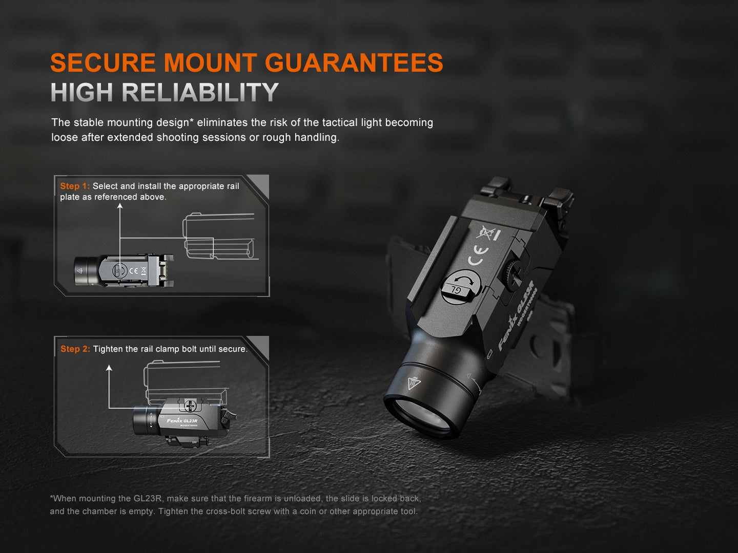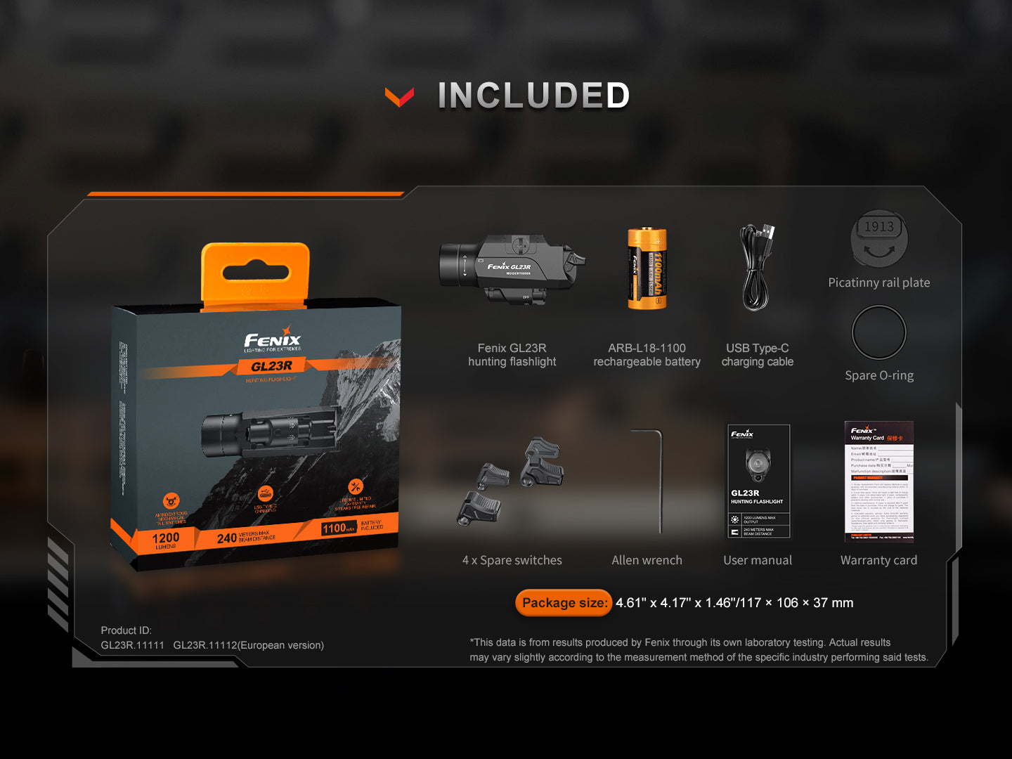 << PACKAGE INCLUDE >> 1 x Fenix GL23R tactical flashlight 1 x Fenix ARB-L18-1100P 18350 battery 1 x USB-C charging cable 1 x Picatinny rail plate 1 x Glock rail plate 4 x Modular Switches 1 x Spare o-ring 1 x Allen wrench 1 x User manual 1 x Warranty card |