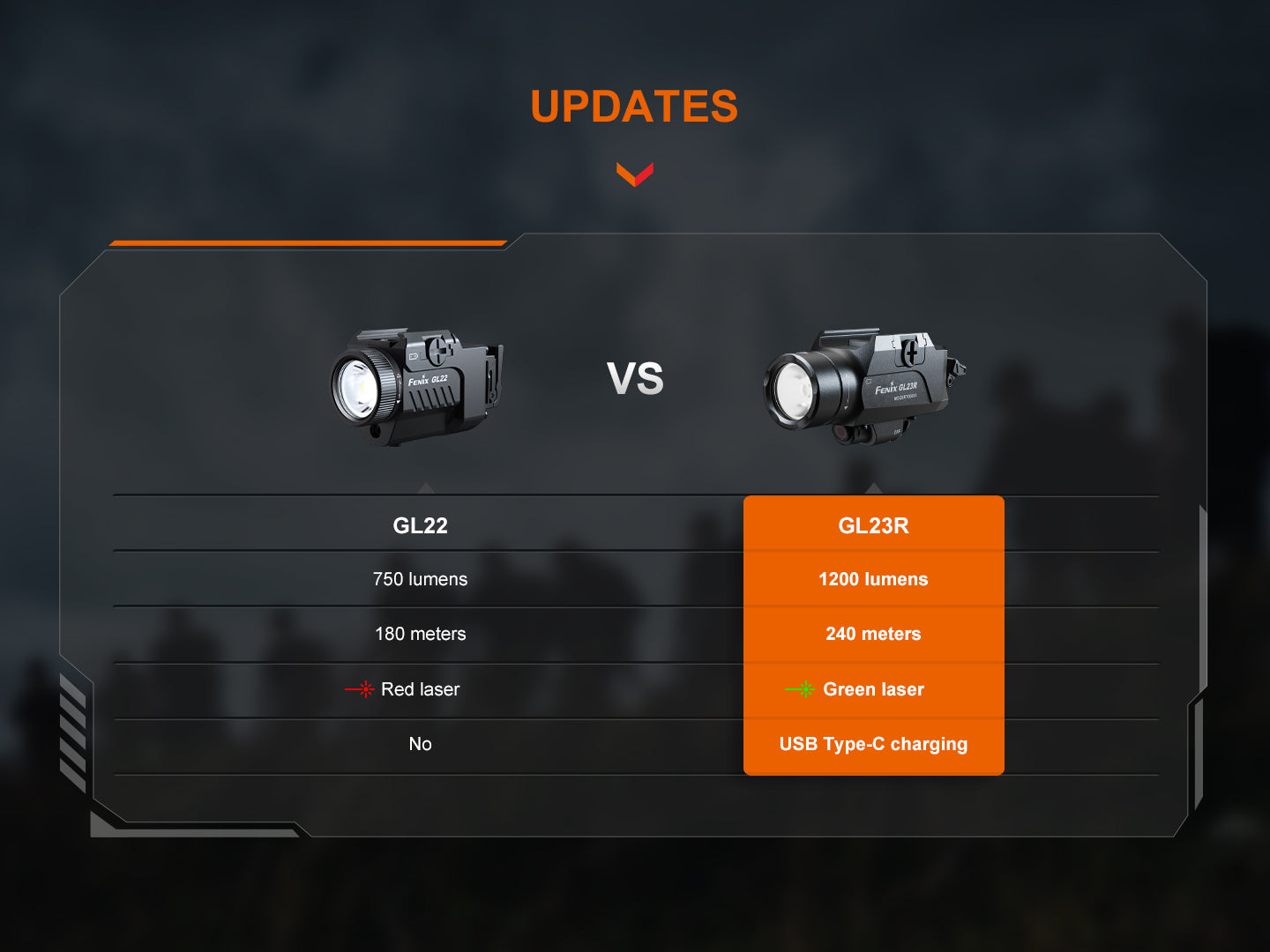 << KEY FEATURES >> ✅ 1200 lumens max output illuminate up to 210 meters; ✅ Customizable switches with ambidextrous power and output selection, allowing seamless operation for both left- and right-handed users; ✅ Capable of illuminating targets up to 240 meters away, boasts a minimal laser offset of less than .8 mm for precision shooting; ✅ With 13-hour green laser runtime; ✅ USB Type-C charging port for fast & convenient charging; ✅ Made of durable & lightweight aluminum alloy; ✅ Waterproof & shockproof. |