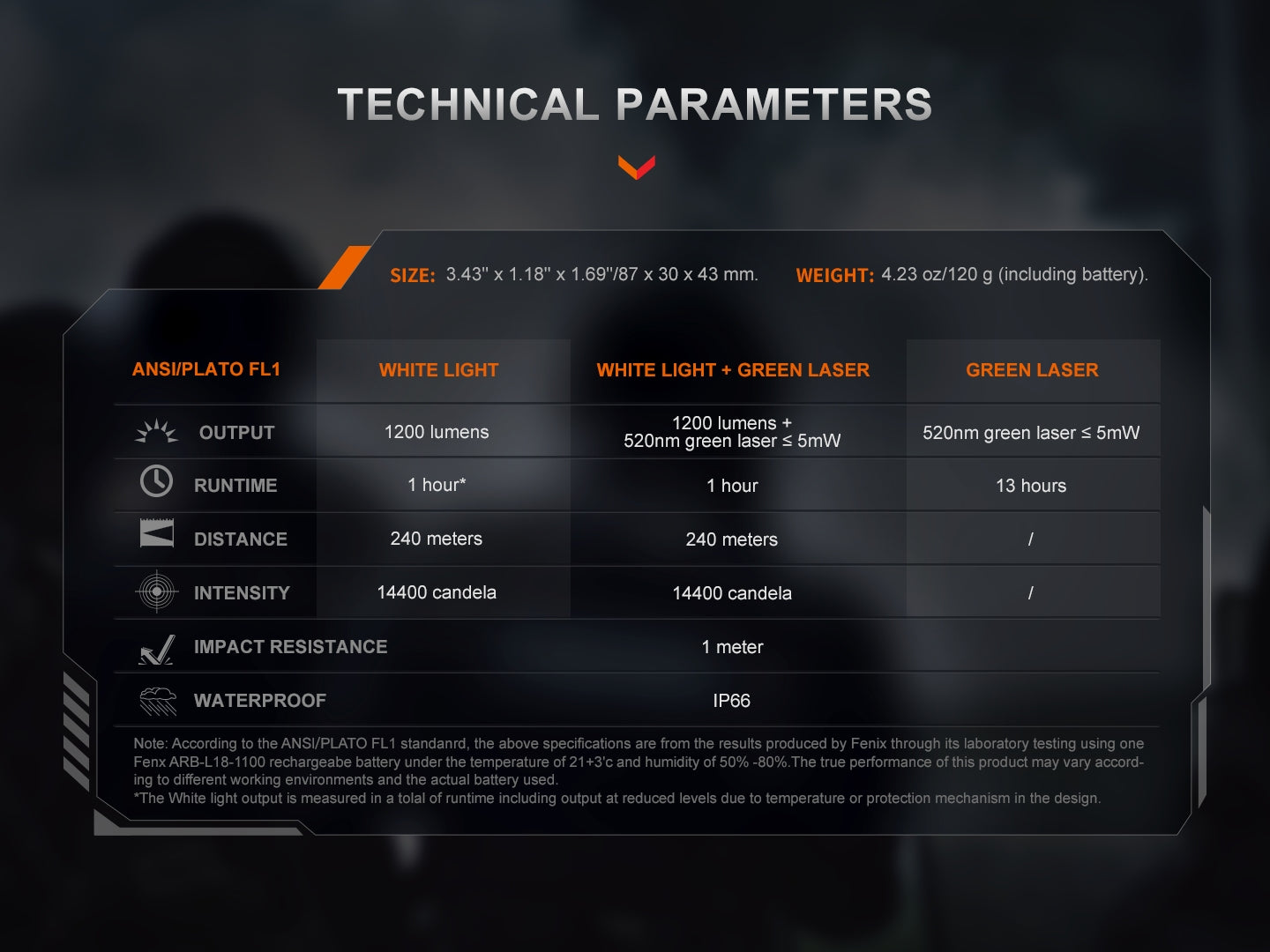 << SPECIFICATIONS >> ✔ No. of mode, brightness & runtime : I. White Light : 1,200 lumens I 1 hr II. White Light + Green Light : 1,200 lumens + 520nm green laser (less than equal to 5mW) I 1 hr III. Green Laser : 520nm green laser (less than equal to 5mW) I 13 hr ✔ Beam distance (max) : 240 meters ✔ Beam intensity : 14,400 cd ✔ Battery use : 1 x 18350 li-ion battery ✔ Impact resistance : 1 meter ✔ Waterproof rating : IP66 ✔ Dimension : 87.1 x 42.9 x 29.9 mm ✔ Weight : 120 grams including battery |