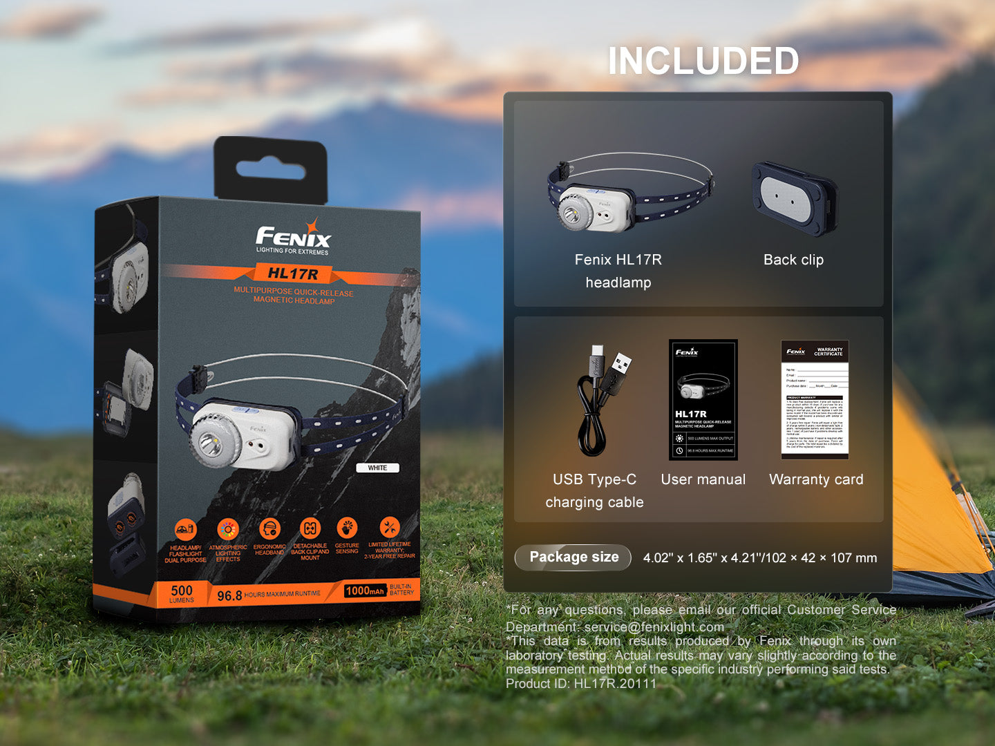 << PACKAGE INCLUDE >> 1 x Fenix HL17R headlamp 1 x Back clip 1 x USB-C charging cable 1 x User manual |