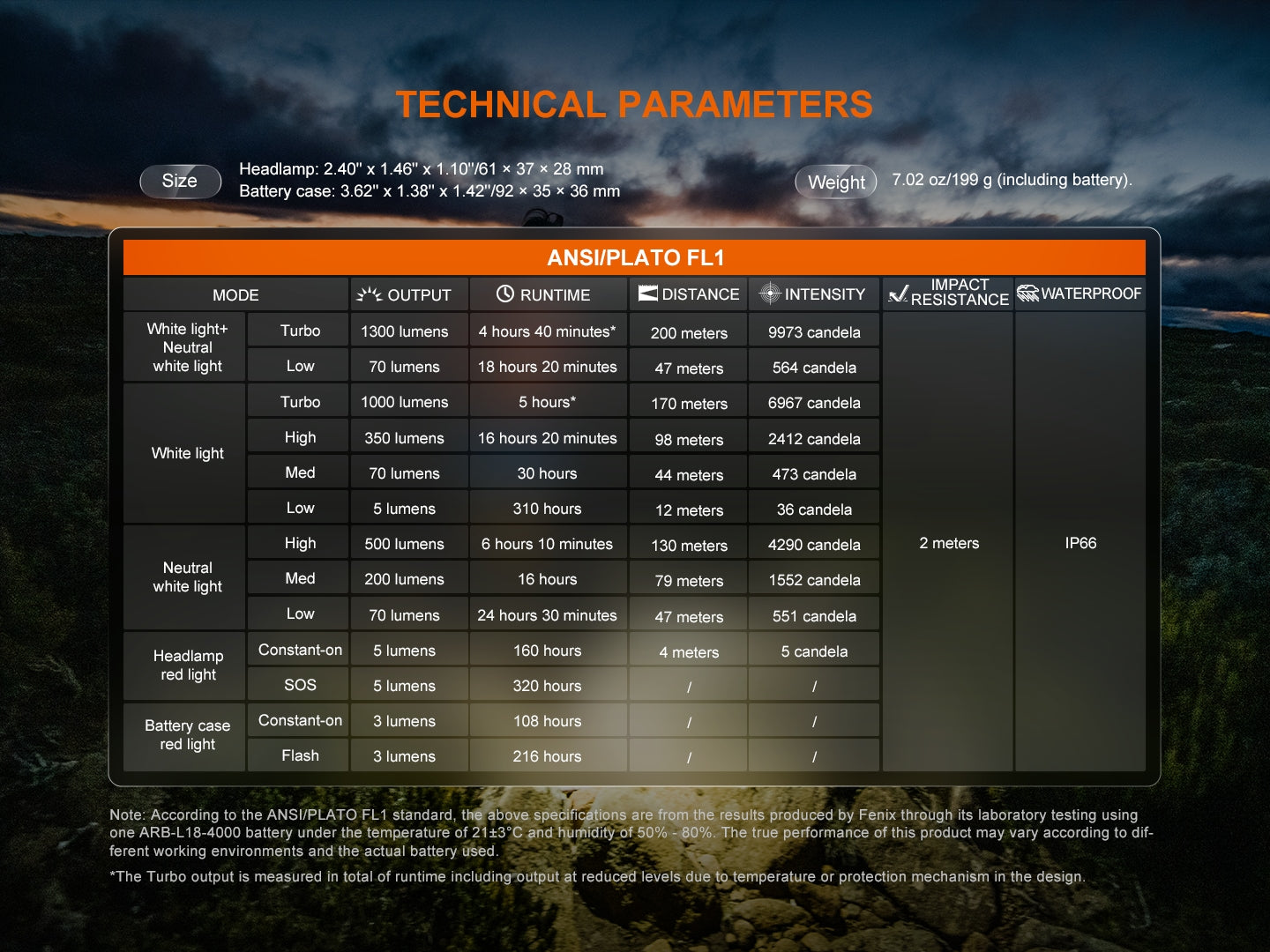 << SPECIFICATIONS >> ✔ LED : I. Cool white : 1 x Luminus SST25 II. Neutral white : 1 x Luminus SST25 III. Red light : 2 x 2835 ✔ No. of mode, brightness & runtime : I. White light : 1. Turbo : 1,000 lumens I 5 hrs 2. High : 350 lumens I 16 hrs 20 mins 3. Mid : 70 lumens I 30 hrs 4. Low : 5 lumens / 24 hrs II. Neutral white : 1. High : 500 lumens I 6 hrs 10 mins 2. Mid : 200 lumens I 16 hrs 3. Low : 70 lumens I 24 hrs 30 mins III. White + neutral white : 1. Turbo : 1,300 lumens I 4 hrs 40 mins 2. Low : 70 lumens I 18 hrs 20 mins IV. Red light : 1. Constant : 5 lumens I 160 hrs 2. SOS : 5 lumens I 320 hrs V. Battery case red light : 1. Constant : 3 lumens I 108 hrs 2. SOS : 3 lumens I 216 hrs ✔ Beam distance (max) : 200 meters ✔ Beam intensity (max) : 9,973 cd ✔ Battery use : 1 x 18650 li-ion battery ✔ Impact resistant : 2 meters ✔ Waterproof rating : IP66 ✔ Dimension : I. Headlamp : 61 x 37 x 28 mm II. Battery case : 92 x 35 x 36 mm ✔ Weight : 199 grams |