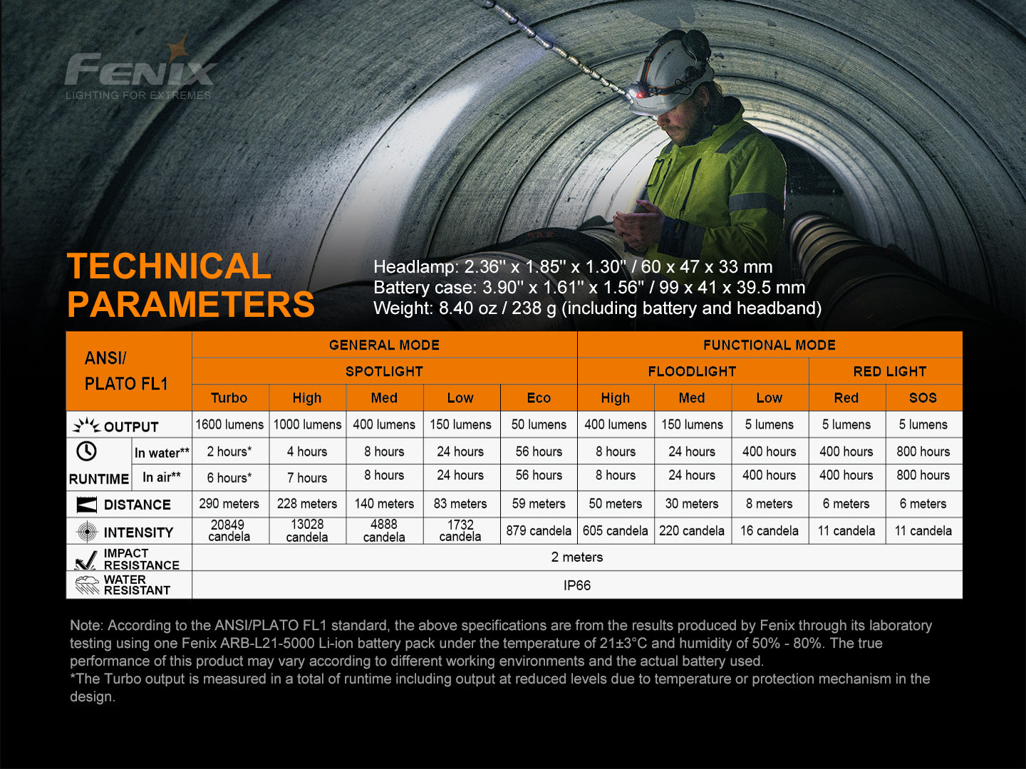 << SPECIFICATIONS >> ✔ LED : I. Spotlight : 1 x Luminus SST40 II. Floodlight : 1 x Cree XP-G3 S4 III. Red light : 1 x Cree XP-G2 R5 ✔ No. of mode, brightness & runtime : I. Spotlight : 1. Turbo : 1,600 lumens / 2 hrs 2. High : 1,000 lumens / 4 hrs 3. Mid : 400 lumens / 8 hrs 4. Low : 150 lumens / 24 hrs 5. Eco : 50 lumens / 56 hrs II. Floodlight : 1. High : 400 lumens / 8 hrs 2. Mid : 150 lumens / 24 hrs 3. Low : 5 lumens / 400 hrs III. Red light : 1. Constant : 5 lumens / 400 hrs 2. SOS : 5 lumens / 800 hrs ✔ Beam distance (max) : 290 meters ✔ Beam intensity (max) : 20,849 cd ✔ Battery use : 1 x 21700 li-ion battery ✔ Impact resistant level : 2 meters ✔ Waterproof rating : IP66 ✔ Dimension : I. Lamp : 6 x 4.7 x 3.3 cm II. Battery case : 9.9 x 4.1 x 3.95 cm ✔ Weight : 238 grams |