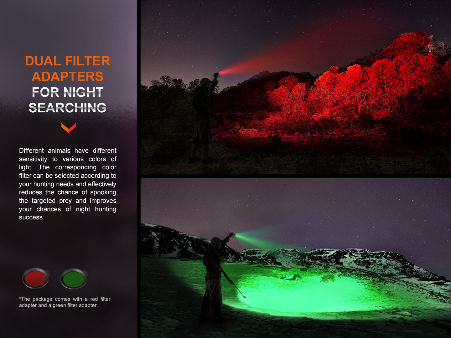 << KEY FEATURES >> ✅ 2,800 lumens max output illuminate up to 1,100 meters; ✅ Included green & red filters for different environment lighting needs; ✅ Dual switch tail switch for easy access to all the 6 lighting modes; ✅ Instant access to strobe & last used mode; ✅ USB-C charging port on flashlight body for convenient & fast charging; ✅ Powered by popular 21700 li-ion battery; ✅ Made of lightweight & high strength aluminum alloy; ✅ Multiple protections : battery reverse polarity, battery over-discharge, & thermal control; ✅ IP68 rated waterproof protection & passed 1 meter drop test. |