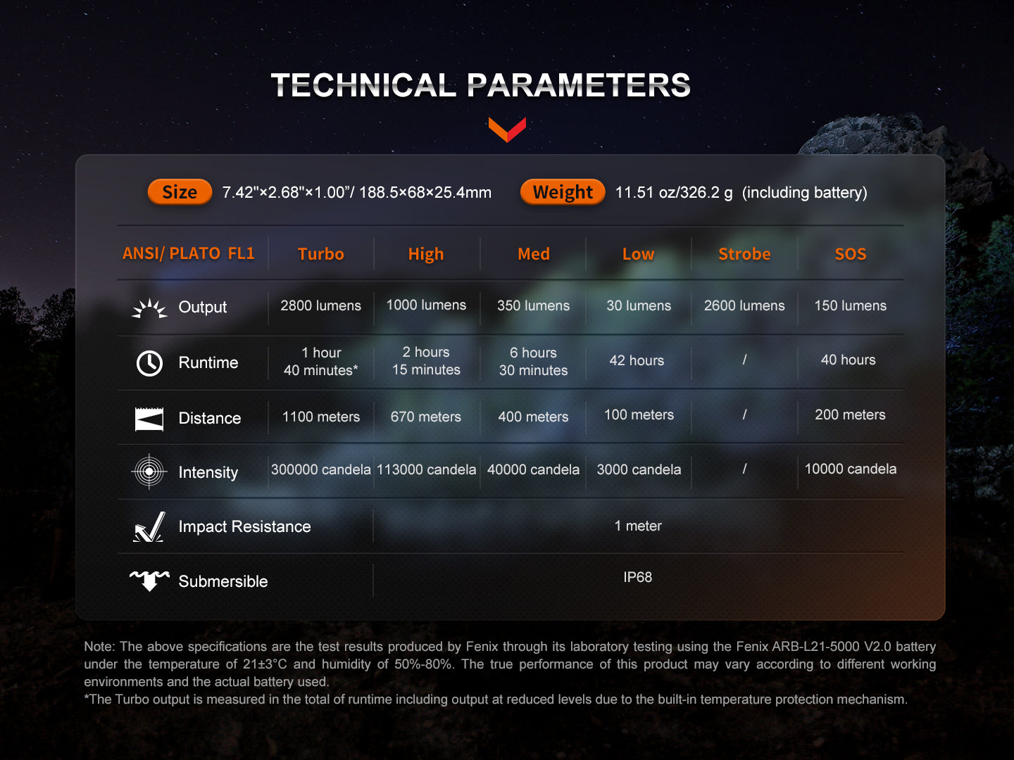 << SPECIFICATIONS >> ✔ LED : 1 x SFT70 white LED ✔ Mode, brightness & runtime : I. Turbo : 2,800 lumens I 1 hr 40 mins II. High: 1,000 lumens I 2 hrs 15 minutes III. Med: 350 lumens I 6 hrs 30 mins IV. Low: 30 lumens I 42 hours V. Strobe: 2,600 lumens I - VI. Strobe: 150 lumens I - ✔ Beam distance (max) : 1,100 meters ✔ Beam intensity (max) : 300,000 cd ✔ Battery use : 1 x 21700 li-ion battery ✔ Impact resistance: 1 meter ✔ Waterproof rating : IP68 ✔ Dimensions : 188.5 x 68 x 25.4 mm ✔ Weight : 326.2 grams (including battery) |