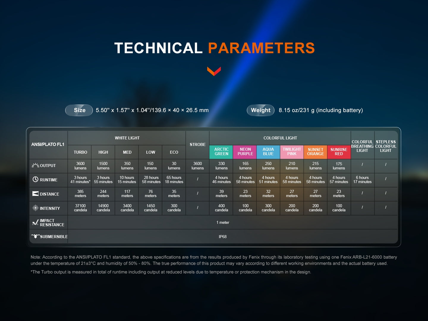 << SPECIFICATIONS >> ✔ Mode, runtime & brightness : I. White light : 1. Turbo : 3,600 lumens I 3 hrs 41 mins 2. High : 1,500 lumens I 3 hrs 55 mins 3. Med : 350 lumens I 10 hrs 15 mins 4. Low : 150 lumens I 28 hrs 58 mins 5. ECO : 30 lumens I 65 hrs 18 mins 6. Strobe : 3,600 lumens I - II. Colorful light (6 colors) : 1. Arctic green : 330 lumens I 4 hrs 46 mins 2. Neon purple : 165 lumens I 4 hrs 46 mins 3. Aqua blue : 250 lumens I 4 hrs 51 mins 4. Twilight pink : 210 lumens I 4 hrs 58 mins 5. Sunset orange : 215 lumens I 4 hrs 58 mins 6. Sunrise red : 175 lumens I 4 hrs 57 mins 7. Colorful breathing light : - I 6 hrs 17 mins 8. Stepless colorful light : - I - ✔ Beam distance (max) : 385 meters ✔ Battery use : 1 x 21700 li-ion battery ✔ Waterproof rating : IP68 ✔ Impact resistance : 1 meter ✔ Dimension : 139.6 x 40 x 26.5 mm ✔ Weight : 231 grams |