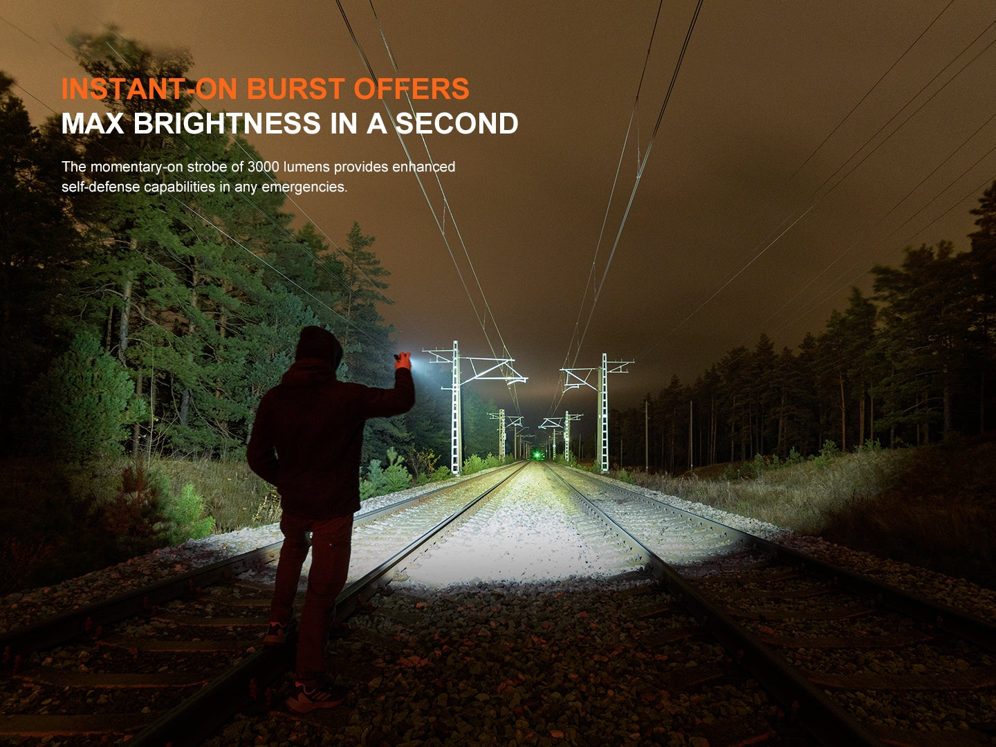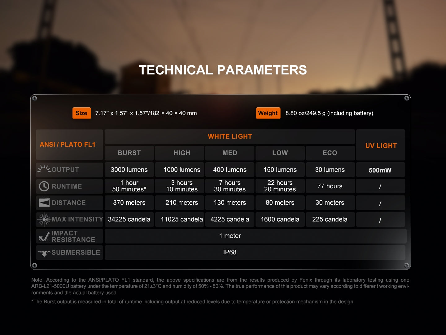 << SPECIFICATIONS >> ✔ LED : 1 x SST70 LED & 1 x 365nm UV LED (500mW) ✔ Mode, brightness & runtime : I. Turbo : 3,000 lumens I 1 hr 50 mins II. High : 1,000 lumens I 3 hrs 10 mins III. Mid : 400 lumens I 7 hrs 30 mins IV. Low : 150 lumens I 22 hrs 20 mins V. Eco : 30 lumens I 77 hrs VI. UV light : 500mW ✔ Beam distance (max) : 370 meters ✔ Beam Intensity (max) : 34,225 cd ✔ Battery use : 1 x 21700 li-ion battery ✔ Waterproof rating: IP68 ✔ Impact resistance: 1 meter ✔ Dimensions : 182 x 40 x 40 mm ✔ Weight : 249.5 grams with battery |