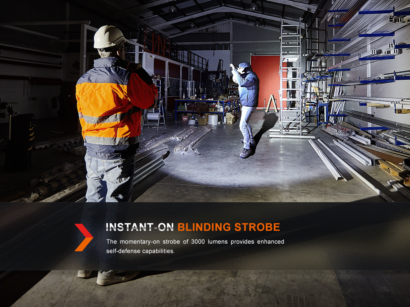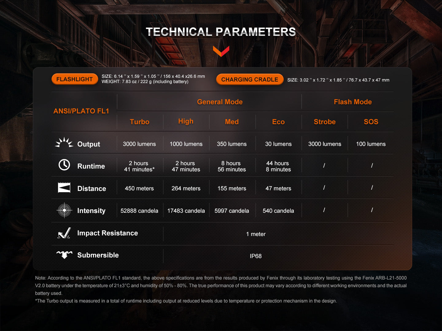 << SPECIFICATIONS >> ✔ LED: 1 x Luminus SSST-70X-W LED (6500K) ✔ Mode, brightness & runtime : I. Turbo : 3,000 lumens / 2 hrs 41 mins II. High : 1,000 lumens / 2 hrs 47 mins III. Medium : 350 lumens / 8 hrs 56 mins IV. Eco : 30 lumens / 44 hrs 8 mins V. SOS : 100 lumens / - VI. Strobe : 3,000 lumens / - ✔ Beam distance (max) : 450 meters ✔ Beam Intensity (max) : 52,888 cd ✔ Battery use : 1 x 21700 li-ion battery ✔ Waterproof rating: IP68 ✔ Impact resistance: 1 meter ✔ Dimensions : 156 x 41 x 27 mm ✔ Weight : 222 grams with battery |